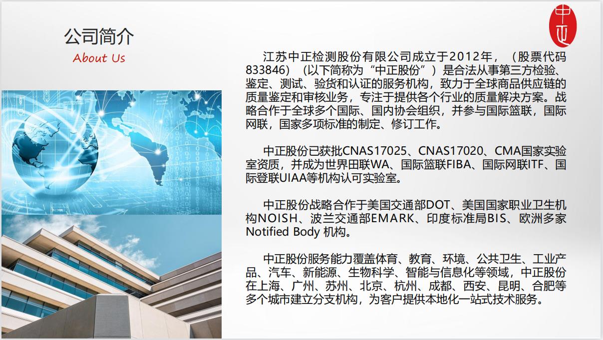 江苏中正检测股份有限公司(简称中正检测),是合法从事国际体育协会检测认证、体育场馆测试、高危场馆检测的第三方服务机构,致力于全球商品供应链的质量鉴定和审核业务,专注于提供各个行业的质量解决方案。