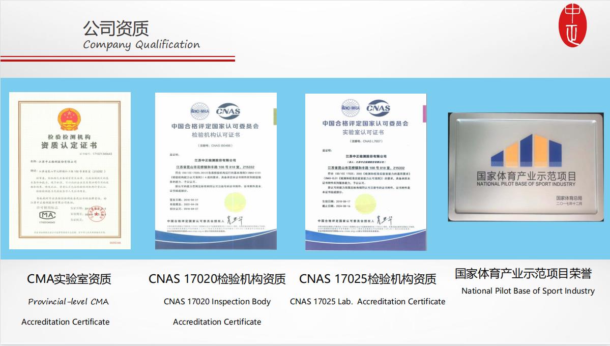 江苏中正检测股份有限公司(简称中正检测),是合法从事国际体育协会检测认证、体育场馆测试、高危场馆检测的第三方服务机构,致力于全球商品供应链的质量鉴定和审核业务,专注于提供各个行业的质量解决方案。